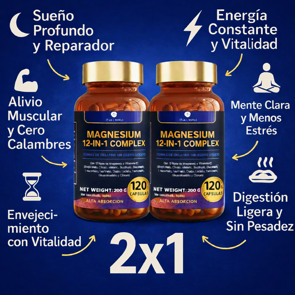 El Magnesium 12 en 1 Complex es la llave para recuperar el equilibrio de tu cuerpo. Gracias a su fórmula única con 12 tipos de magnesio activos, experimentarás una mejoría completa en tu calidad de vida, atacando las causas del cansancio y el malestar desde la raíz.